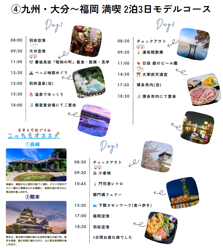 九州の名観光地をガッツリ巡る2泊3日、一度は計画したい漫喫プランです!